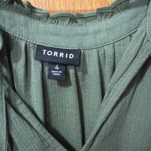 This Torrid blouse in a rich green hue offers a relaxed fit with long sleeves and pleated detailing. Crafted from a soft, flowing fabric, it features a V-neckline with a subtle tie detail, making it a versatile addition to any wardrobe.