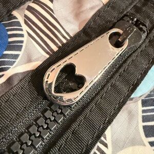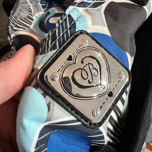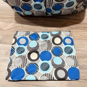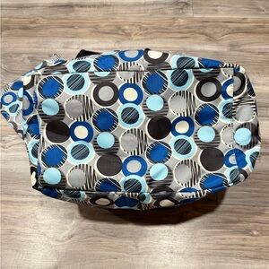 Stylish Brighton tote with blue and gray circular patterns. Perfect for everyday use. Lock and keys to secure you belongings while traveling or every day. Airplane bag. Travel bog. Tote.