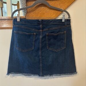 Chic dark blue denim mini skirt by Universal Thread. Features a frayed hem and classic five-pocket design. Ideal for casual wear.