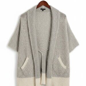 XOXO women's open front cape sweater. It features a distinct textured waffle knit, a shawl collar, and short sleeves, finished with cream-colored ribbed trim on the hem and pockets