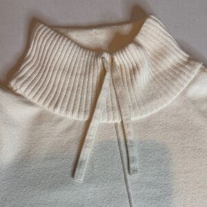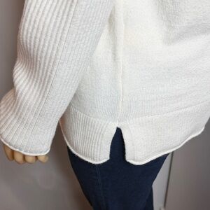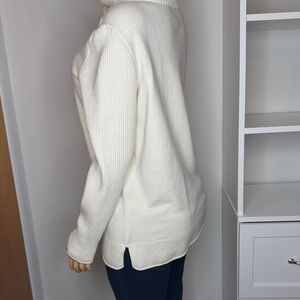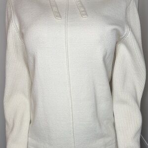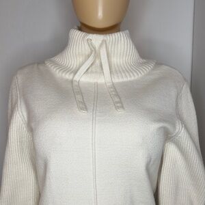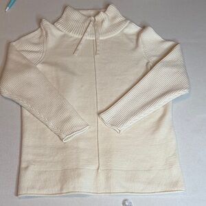 Soft and cozy Sonoma sweater in a women’s Large. Classic cream/ivory color with ribbed sleeves, a warm mock-neck, and a clean front seam detail. Easy to style for fall, winter, or a polished casual look.