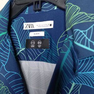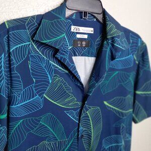 ZARA short-sleeve Hawaiian shirt with blue and green leaf print.