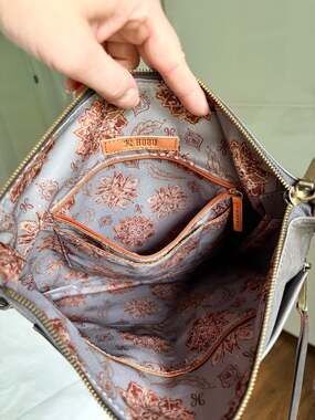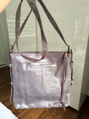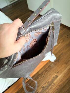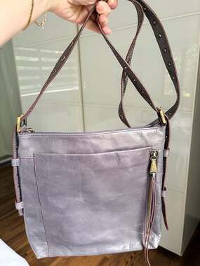 This stylish hands-free bag is crafted from high-quality metallic leather with a subtle gray sheen. It features a spacious main compartment with the signature HOBO patterned lining, including a zip pocket and slip pockets for organization. The exterior includes multiple zip and slip pockets for quick access to your essentials.
