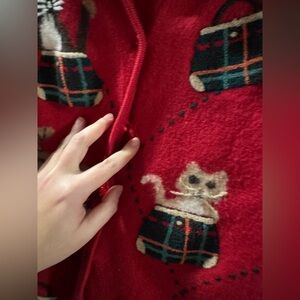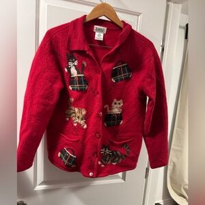 Cozy red cardigan with playful cat patterns. Perfect for cat lovers. Size large but runs much smaller Missing 1 button