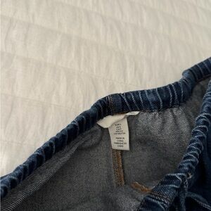 Stylish dark blue denim shorts with an elastic waistband and drawstring.