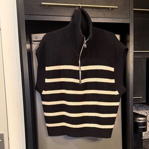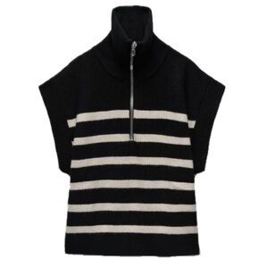 Zara sleeveless zip up sweater. Black and cream large stripes. High neck. Silver hardware. In good condition! Material composition: 59% Acrylic, 30% Polyester, 11% Nylon.