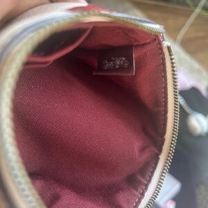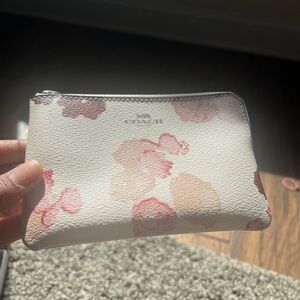 Coach wristlet in white leather-print with pink floral motifs. Top zip closure and detachable wrist strap. Compact, stylish accessory for everyday use.
