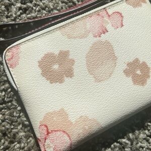 This item is a Coach Small Corner Zip Wristlet featuring a floral brushstroke design.