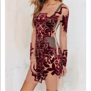 The Vienna Dress is made in sheer nude mesh and features burgundy crushed velvet design, gunmetal beading, and side zip closure. Wear it with a dainty ear cuff, black lace bra, and high-waisted panties. By For Love & Lemons.