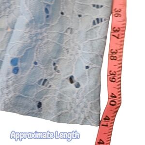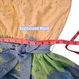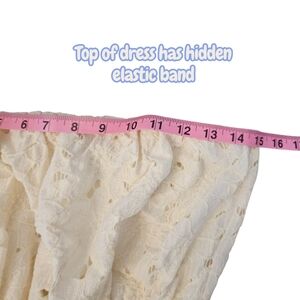 Strapless colorblock woven lace midi dress with waist tie for a flattering fit. Soft eyelet fabric adds subtle texture. Breezy and feminine for warm days.