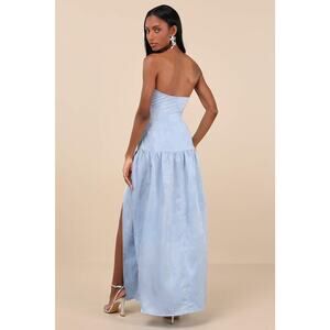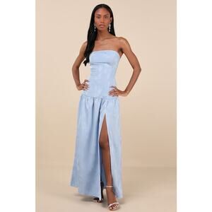 The Lulus Gemmi Light Blue Satin Jacquard Drop Waist Maxi Dress is chic and exceptional at making a perfect first impression! Sleek satin jacquard shapes this strapless dress that features princess-seam details and a straight neckline. The figure-flaunting silhouette continues down to a drop waist and a flaring skirt with a side slit and maxi hem. Hidden no-slip strips and a hidden side zipper/clasp.