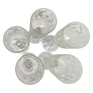 Edwardian Venetian Hand Blown-Engraved Griffin Wine Glasses are a set of five exquisite wine glasses crafted in Venice around the year 1900. These stemmed, etched glasses feature a beautiful griffin pattern, making them a unique and stylish addition to your barware collection. Handmade with clear glass and a capacity of 4 oz, these wine glasses are perfect for all occasions and are sure to impress with their decorative, design. Ideal for collectors or those looking to add a touch of vintage elegance to their kitchen or dining space, these wine glasses are a true representation of the Art Glass movement from the early 1900s.