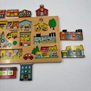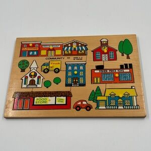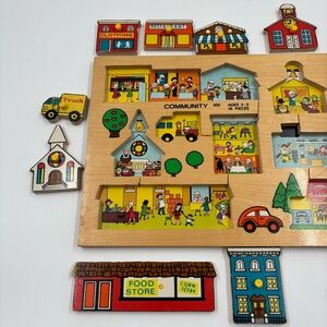 A rare treasure for collectors! This Fisher-Price Simplex "Community 502" wooden peg puzzle features the iconic "Pick-up & Peek" design. Not only are the 10 pieces shaped like classic town buildings, but lifting each piece reveals a hidden scene inside!