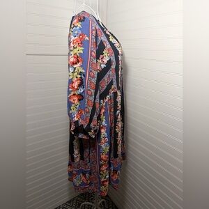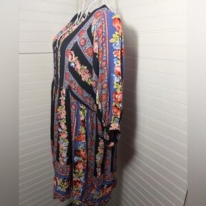 Chic boho dress with floral patterns. Features a V-neck and 3/4 sleeves. Perfect for casual outings.