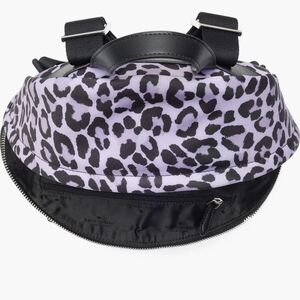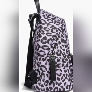 kate spade backpack in a lilac leopard print. Stylish and versatile for everyday use. Features a front zip pocket and durable construction. Lilac and black print adds a bold, modern look.
