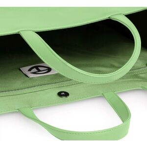 Featuring a double strap (handles and cross-body straps), embossed logo, a main compartment with magnetic snap closure, internal laptop-sized compartment with zipper closure in back and additional internal pocket in front. Made from faux leather and twill lining. Bag is packaged in a 100% cotton drawstring bag with screen-printed logo.