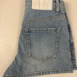 High-rise jean shorts in a light blue wash. Classic five-pocket design with belt loops and a button fly. Casual, versatile piece for warm-weather outfits.