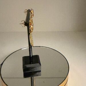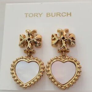 Gold-tone Tory Burch drop earrings. Heart-shaped pendants white mother-of-pearl inlay. Ornate gold trim and branded motif. Feminine and eye-catching.