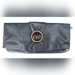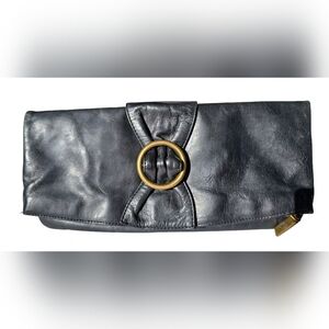 Hobo International Foldover Bow Clutch in black polished leather EUC