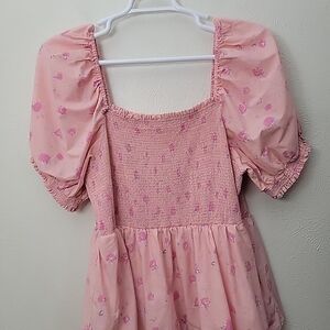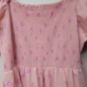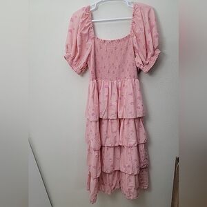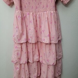 Romantic tiered maxi dress with layered ruffles and smocked top in a size 1X. Soft pink hue with subtle print details. Lightweight, lined flowing fabric for easy movement. Feminine silhouette perfect for day or evening outfits.