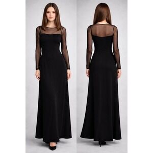 Elegant floor-length gown features a sophisticated sheer mesh yoke and long sleeves that create a stunning illusion neckline. The body is crafted from a smooth, substantial fabric that drapes beautifully into a subtle flare at the hem, offering a timeless silhouette for formal occasions. This piece is in excellent pre-owned condition, perfect for your next evening event or gala. GOTHIC GLAMOUR, VAMPY, MINIMALIST, NOIR, 90s VINTAGE.