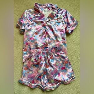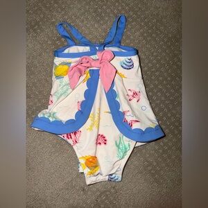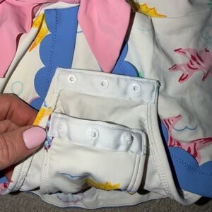 Cute white kids swim one piece with colorful fish and seaweed print. Features bright pink, orange and green fish motifs and blue trim. Comfortable design with secure snaps for easy changes. Soft, quick-drying fabric ideal for pool and beach days.