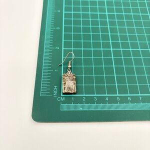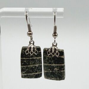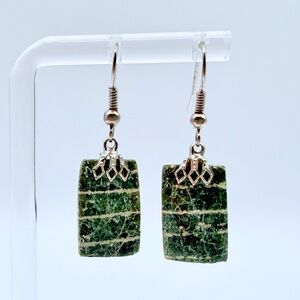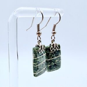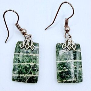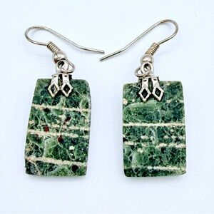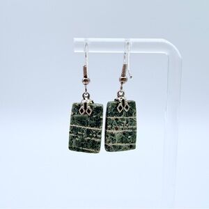 Green Jasper Style Stone Dangle Earrings Silver Tone Boho Rectangle Drop