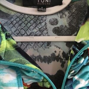 Vibrant floral jacket with a mix of blue, green, and red hues. Excellent condition it has some sequence to it