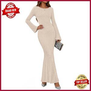 Long Sleeve Ribbed Knit Maxi Dress Boat Neck Bodycon Wedding Guest