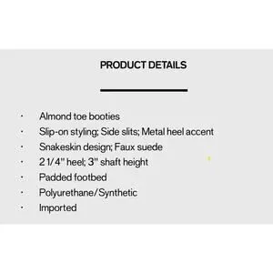 Design: Western-inspired ankle boot with snake print heel panel and side cutout.