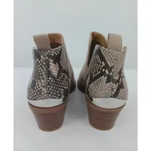 Make a statement with these Express Women's Taupe Suede Ankle Boots with Snake Print Heel. The beautiful taupe suede is complemented by a striking snake print heel panel, adding a touch of edgy sophistication. The side cutout and stacked heel create a modern and flattering silhouette. Perfect for adding a touch of Western-inspired flair to your casual or dressy outfits.