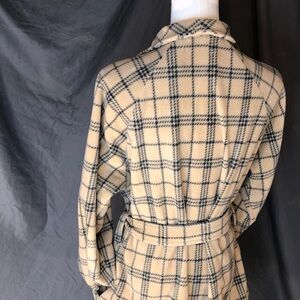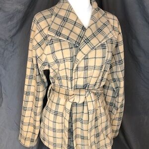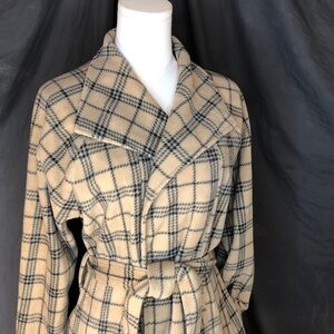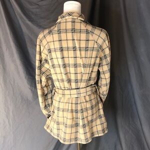 Warm and stylish plaid pattern. Features a cozy belt for a snug fit. Side pockets at each hip . Soft fabric. Comfortable, flexible fit. Perfect for chilly days.