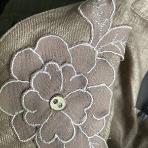 A beautiful Spring/Summer/FALL jacket made with Italian linen Back side has a stretchy breathable linen fabric Gorgeous flower applique on front lapel Zipper closure Two small buttons on hem front Slightly cropped 97% linen 3% polyester Measurements taken flat surface and are approx; Pit to pit-22 Length-24.5 Width at hem-21' Length of sleeves from underpit to slleves hem-12'
