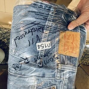 Branding and tags: Tan Levi Strauss & Co. two-horse leather patch at back waist marked 505 W 32 L 32, red Levi's tab at back pocket, metal rivets and button with Levi's branding