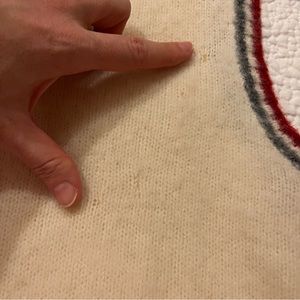 * There are several areas where it appears it has been repaired, as shown—but due to the fuzziness of the wool fabric, they’re not too noticeable.