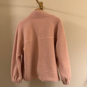 Plush blush pink sherpa pullover. Snap-front placket with metal snaps. Soft textured fleece for cozy wear. Casual layering piece with subtle sheen trim. Zip pocket and hoodie pocket.