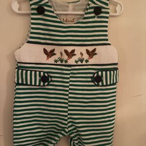 Adorable green and white striped baby romper with embroidered ducks. Features button details.