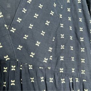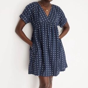 The Madewell V-Neck Dolman Sleeve Mini Dress in textured navy polka dot with white accents is a stylish and trendy option for casual summer occasions. Made of comfortable cotton material, this short-sleeved dress features a flattering V-neckline and embroidered accents for added charm. The blue color and colorful theme make it a fun and vibrant choice for any woman's wardrobe. Easy to care for with machine washable instructions, this dress is a great addition for those who love the Barbie-inspired look.