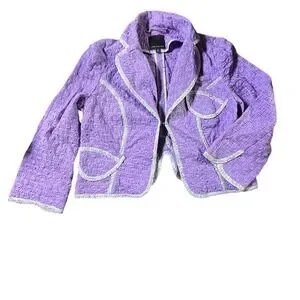 A women's purple textured blazer jacket from The Limited. This stylish jacket features a unique allover circular cutout texture and a contrasting embroidered trim along the lapels, pockets, and hem. Designed with a classic notched lapel and a single-button closure, it offers a polished look. Perfect for elevating a casual outfit or adding a touch of sophistication to workwear.