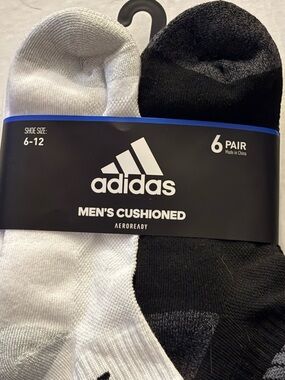 Adidas Men's Cushioned Socks - 6 Pairs Black and White NWT Aeroready Fits 6-12