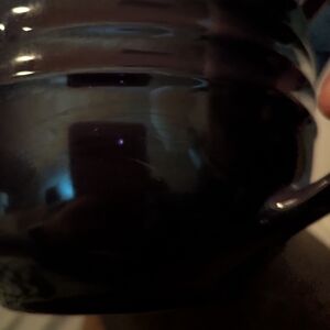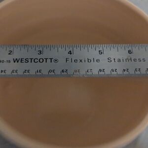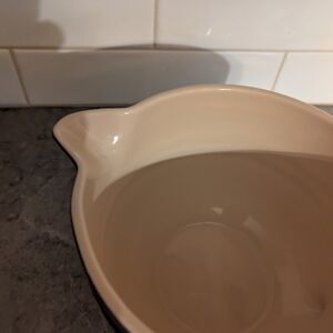 Le Creuset stoneware batter bowl. Deep purple exterior with cream interior. Poured spout and handle for easy use. Classic embossed Le Creuset logo on the side.