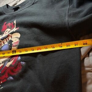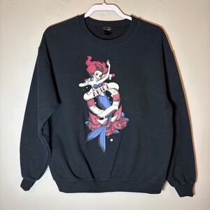 Disney The Little Mermaid Ariel crewneck sweatshirt features a unique tattoo-style graphic of Ariel with an anchor and roses. This black pullover is crafted from a soft cotton-polyester fleece blend, offering a cozy feel with a classic ribbed crew neckline, cuffs, and hem. The vibrant front print showcases a stylized, edgy take on the classic Disney princess, making it a standout piece for fans of the film or those who appreciate alternative Disney apparel.