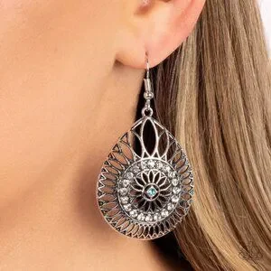 Dotted with a dainty blue rhinestone center, a silver flower blooms inside a ring of glittery white rhinestones amidst an airy backdrop of silver petals for a seasonal finish. Earring attaches to a standard fishhook fitting.