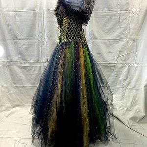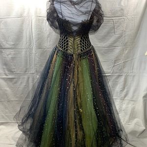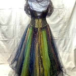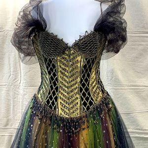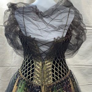 The gown features a striking gold embroidered corset-style bodice with exceptionally intricate beading and embellishment, paired with a breathtaking full multicolor tulle skirt adorned with scattered crystal details that create beautiful movement, dimension, and light. The overall effect is dramatic, romantic, and unmistakably theatrical — a true expression of the fantasy, glamour, and craftsmanship for which Mackie is celebrated.