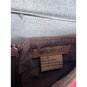 Arden B brown suede leather mini skirt features a charming boho aesthetic with colorful floral and butterfly applique details. Crafted from 100% genuine leather, this A-line silhouette includes a hidden back zipper closure and decorative contrast stitching along the waistband. The earthy brown tone is complemented by vibrant red, pink, and tan leather patches, making it a standout piece for vintage-inspired or eclectic wardrobes.