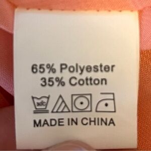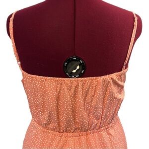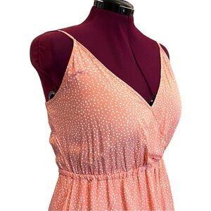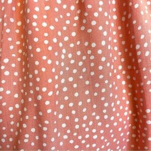 Just a pretty, easy pink with white polka dot pull over dress. Faux wrap top with adjustable spaghetti straps. Elastic waist and fuller skirt with ruffle hem. Light and cool poly-cotton blend material. Perfect for a hot summer day! Purchased from Amazon and unbranded.