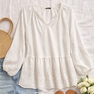 Beautiful white boho-style blouse featuring delicate eyelet lace detailing and a flattering peplum silhouette. Lightweight and flowy with soft gathered neckline and billowy sleeves—perfect for a feminine, effortless look.
