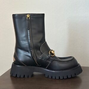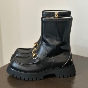 NIB Gucci Cordovan Lux Black Leather Horsebit Bee Embroidered Combat Boots 37.5