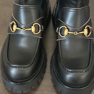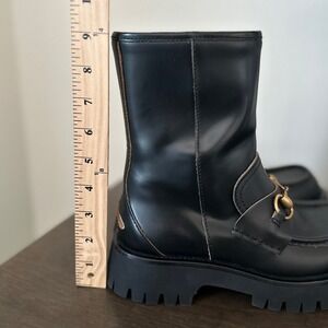 This is an authentic pair of GUCCI Cordovan Lux Women's Harald Horsebit 25mm Platform Boots size 37 1/2 in Black. These chic combat boots are crafted of black leather with an aged-gold horsebit detail across the vamp and embroidered gold bee at the heel. The boots feature a lug platform sole on a 1.75-inch heel.