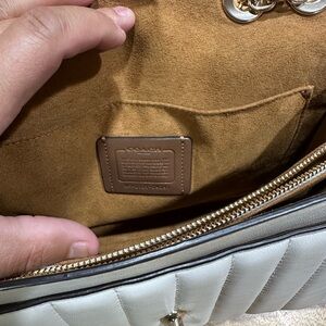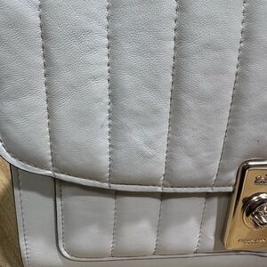 Chic white quilted shoulder bag by Coach. Features a gold chain-and-leather strap. Front turn-lock hardware in gold. Structured silhouette with vertical quilting.